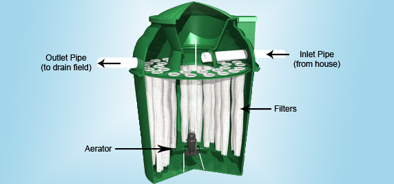 A Multi-Flo is a fiberglass aeration system. All wastewater used in the house enters the tank. A submersible aerator sits in the bottom the tank and distributes oxygen into the wastewater. This disolved oxygen allows aerobic bacteria to develop. The bacteria cling to 30 large cotton sock filters that hang in the tank. These filters also restrict any solid waste from escaping the tank.
